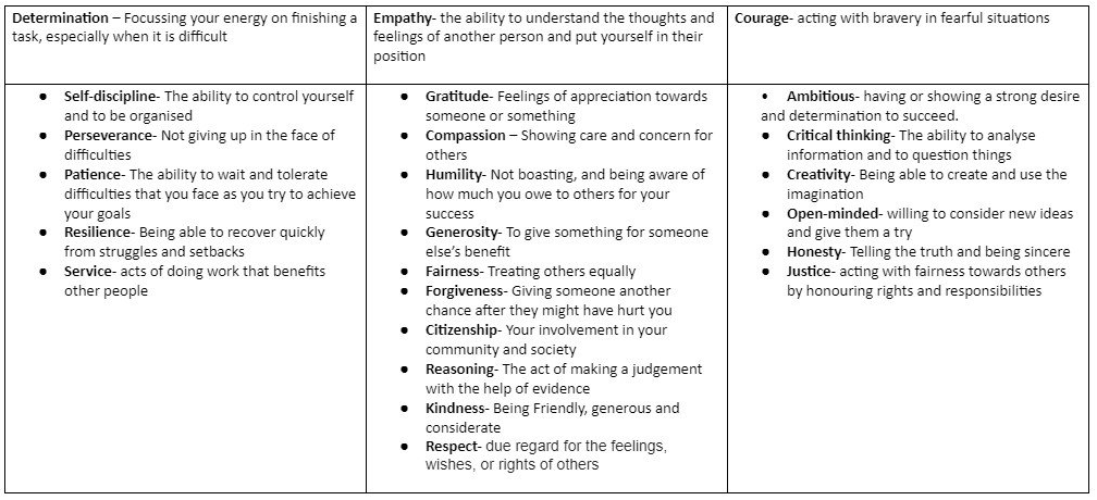 Underpinning our work on Character are our three core values. Everything that we do links to our core values and the virtues that students need to fulfil each value: